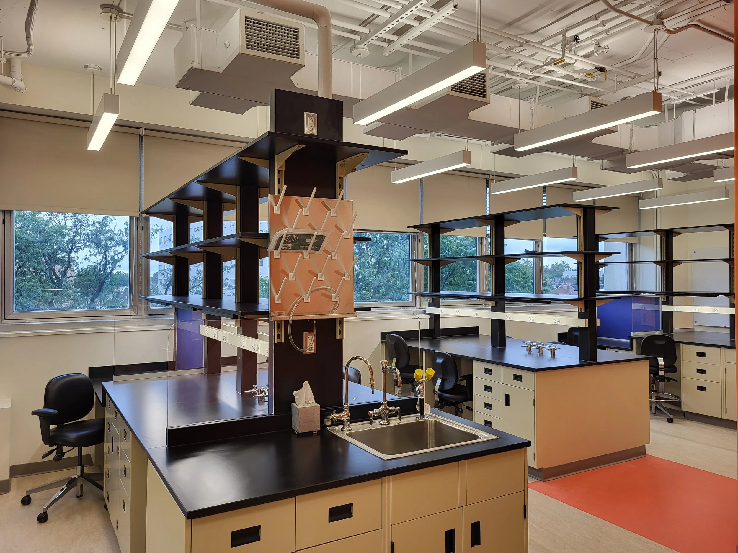 The scope of work was a complete gut and renovation of two lab spaces for conversion into a new wet laboratory, a microscopy suite, researcher office space, and tissue culture room. The job included all demolition, casework, phenolic lab-tops and shelving, flooring, drywall, painting, electrical systems, plumbing systems including lab gases and HVAC work encompassing new ductwork, new Air Handling Units and VAVs, and fume hoods.